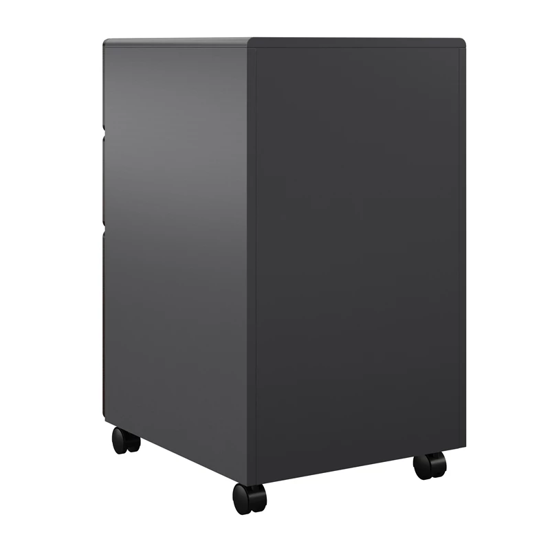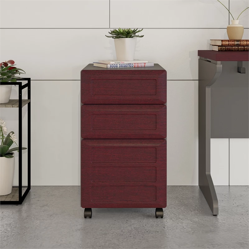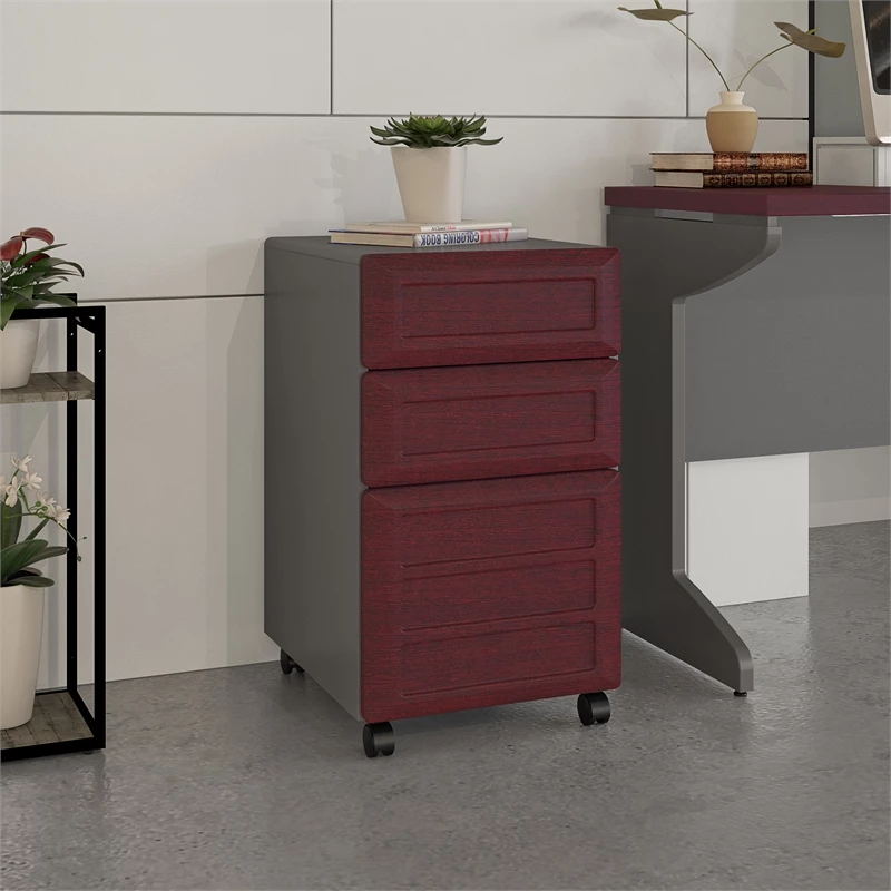 The Altra Pursuit Mobile File Cabinet is the smart office storage you need, whenever and wherever you need it. This commercial grade File Cabinet features 5 rolling casters that give this piece easy mobility throughout your office. File Cabinet features 3 drawers for storing both files and office supplies. The large bottom drawer keeps your files neatly organized, accommodating both legal and letter sized documents. Two smaller drawers on top offer the perfect place for storing office supplies. This Mobile File Cabinet is designed to be a stand-alone piece or it fits perfectly under the Pursuit Executive Desk (sold separately), enabling you to keep your supplies within arm’s reach when you need them. The warm Cherry and dark Gray finishes complement each other for a sophisticated look. Altra Pursuit Mobile File Cabinet requires assembly upon delivery.