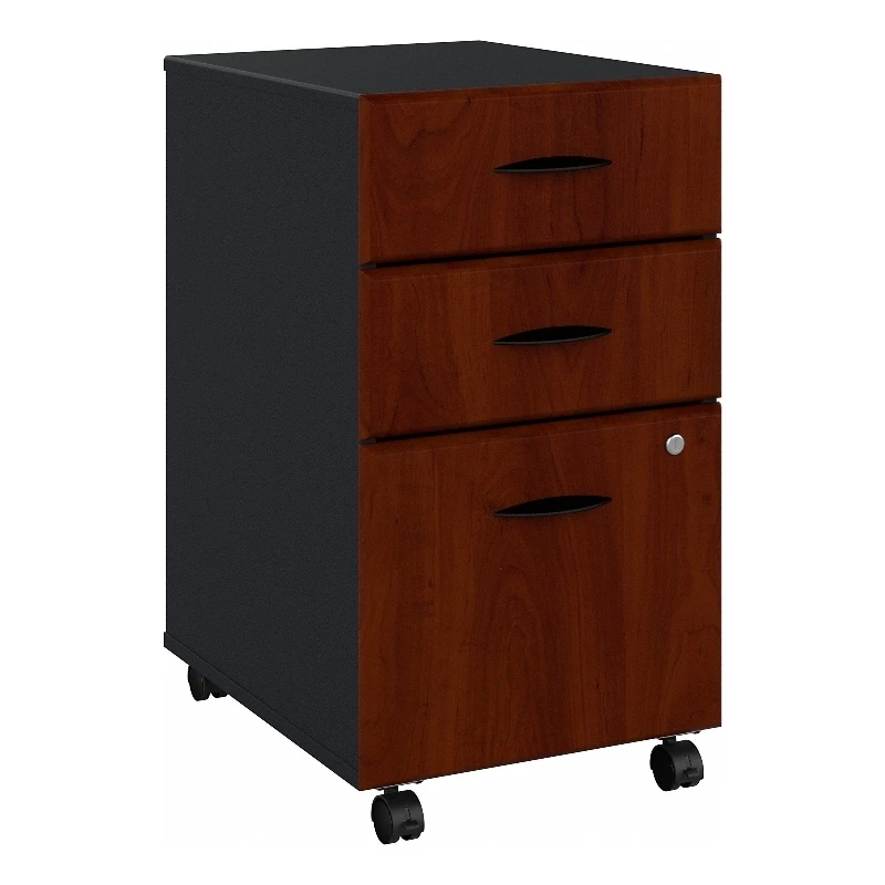 Create more storage space with the affordable and functional Bush Business Furniture Series A 3 Drawer Mobile File Cabinet. With a file drawer gliding on smooth full-extension ball bearing slides, the Cabinet provides effortless access to letter, legal and A4-sized documents. Two box drawers keep office supplies at your fingertips. Slide the Mobile File Cabinet under your Series A Desk to minimize your office footprint, or roll it wherever you need it most. Dual-wheeled, hooded casters ensure easy movement, while a single lock secures the lower two drawers for your privacy. The sturdy construction resists scratches, stains and dents for long-lasting quality. Series A offers a variety of layout options and multiple two-tone finishes. Backed by a 10 Year Warranty.