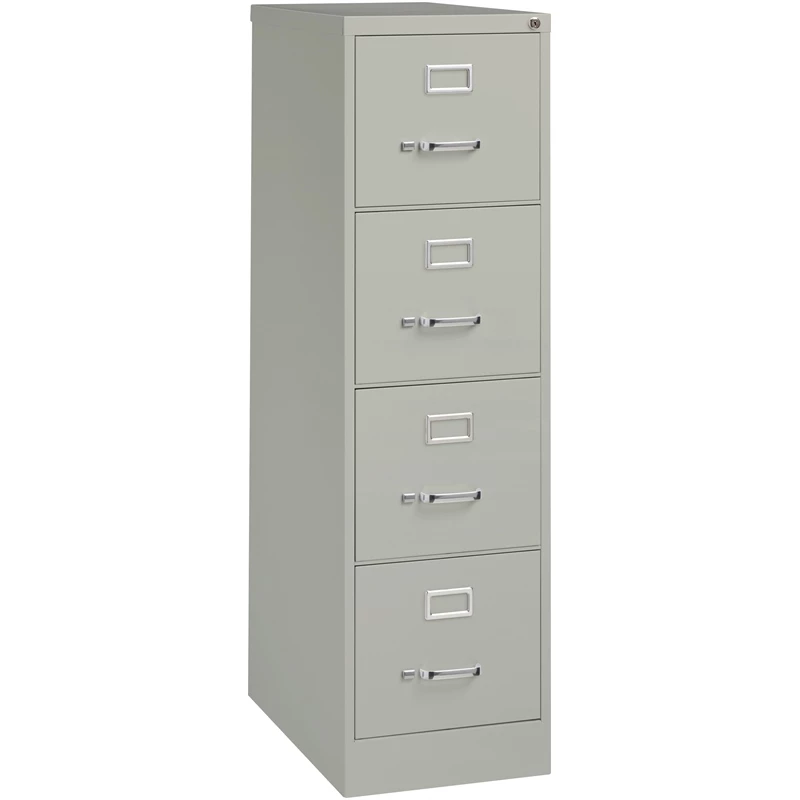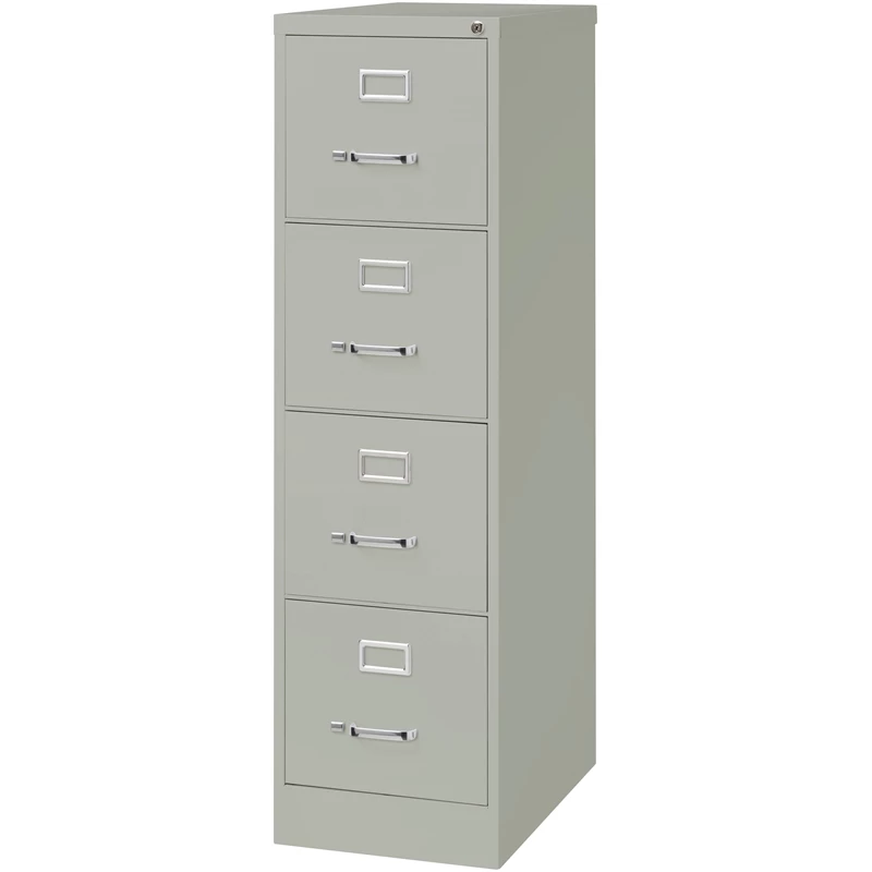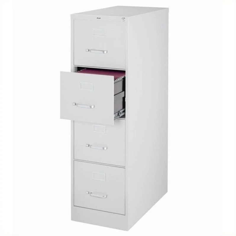 Bowery Hill 25-inch deep metal four-drawer, letter width, commercial grade vertical file cabinets in light gray are perfect for business, educational, or personal offices. These cabinets feature a classic design and are constructed with high quality durable materials that are suitable for heavy-duty use. Ships fully assembled and is ready to accept letter width hanging file folders. Non-porous surface is easy to clean and disinfect. Each drawer includes full extension ball-bearing slides for smooth drawer action. Even fully loaded, these drawers open with ease. Adjustable follower blocks keep files upright. The aluminum handles and label holder are durable and functional making it easy to access and label drawer contents. The included core-removable lock allows cabinets to be keyed alike. Designed to meet or exceed ANSI/BIFMA industry standards for performance and workmanship. Made with 28% total recycled content. Backed by a Limited Lifetime Warranty. TAA Compliant. Greenguard Gold certified for indoor air quality.