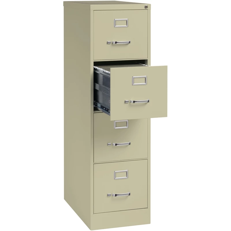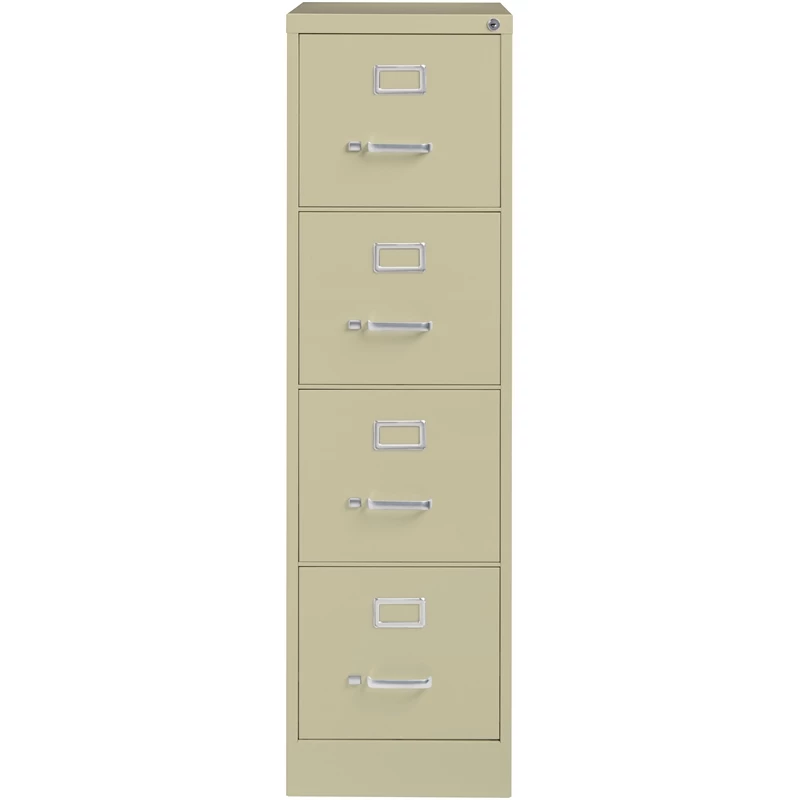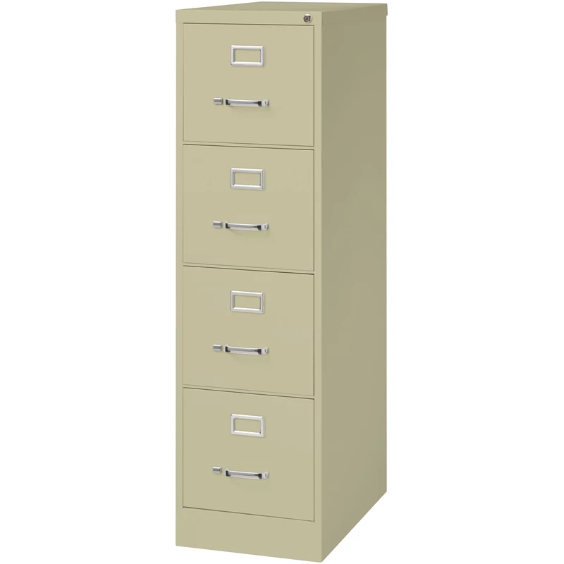 Bowery Hill 25-inch deep metal four-drawer, letter width, commercial grade vertical file cabinets in putty/beige are perfect for business, educational, or personal offices. These cabinets feature a classic design and are constructed with high quality durable materials that are suitable for heavy-duty use. Ships fully assembled and is ready to accept letter width hanging file folders. Non-porous surface is easy to clean. Each drawer includes full extension ball-bearing slides for smooth drawer action. Even fully loaded, these drawers open with ease. Adjustable follower blocks keep files upright. The aluminum handles and label holder are durable and functional making it easy to access and label drawer contents. The included core-removable lock allows cabinets to be keyed alike. Designed to meet or exceed ANSI/BIFMA industry standards for performance and workmanship. Made with 28% total recycled content. Backed by a Limited Lifetime Warranty. TAA Compliant. Greenguard Gold certified for indoor air quality.