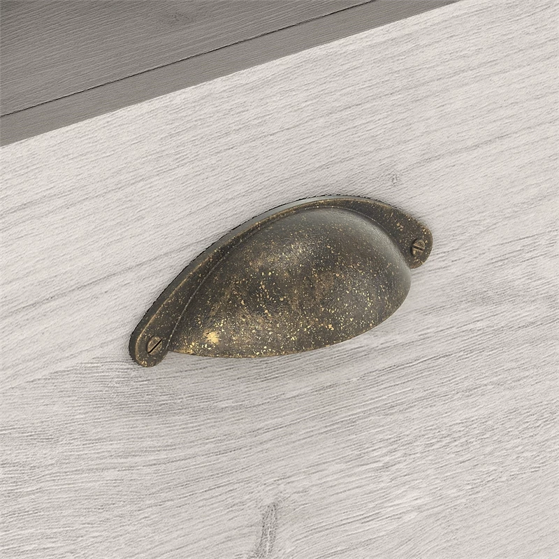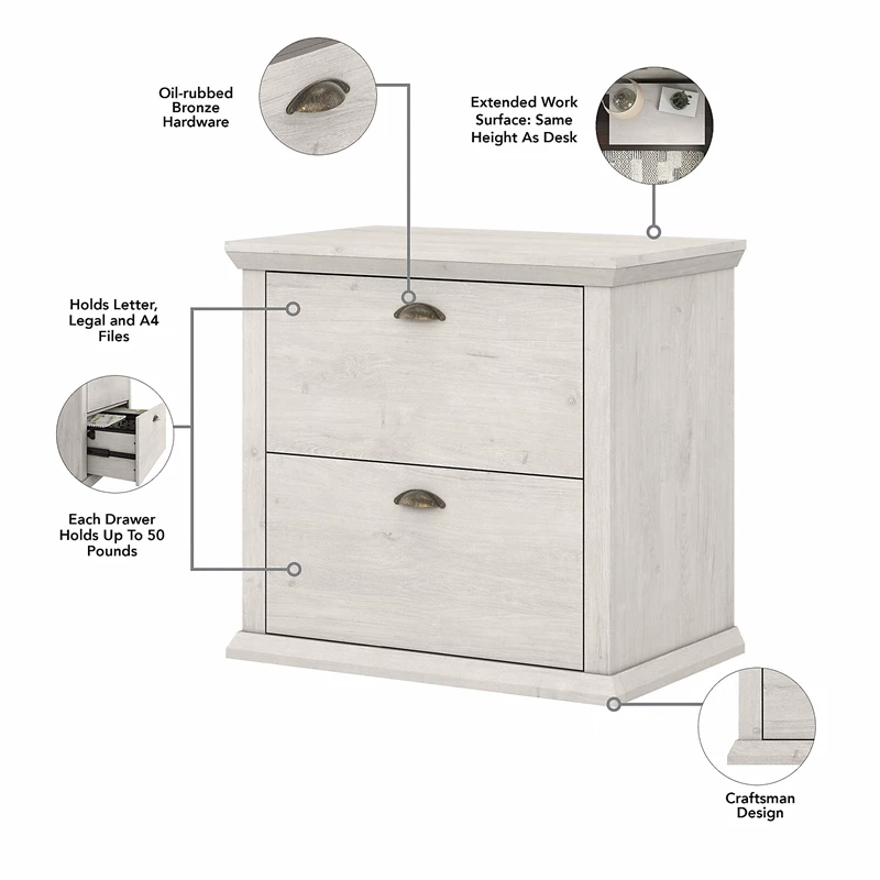 The Bush Furniture Yorktown 2 Drawer Lateral File Cabinet presents a stylish and practical solution for organizing documents in any work or living space. Two file drawers open on smooth full-extension ball bearing slides for an effortless reach to letter, legal and A4-size paperwork. The drawers are designed to extend one at a time for maximum stability on both hard and carpeted surfaces, and each drawer holds up to 50 pounds of materials. The 2 Drawer File Cabinet’s height matches that of the Yorktown L Shaped Desk, Corner Desk and Home Office Desk to create an extended work surface when positioned side by side. Yorktown’s classic charm is highlighted by stylish beveled edge detailing and oil-rubbed Bronze drawer pulls that complement your choice of finish. This lateral filing cabinet is tested to meet ANSI/SOHO standards for safety and performance and is backed by a 1 Year Warranty. Materials: Engineered wood and durable laminates