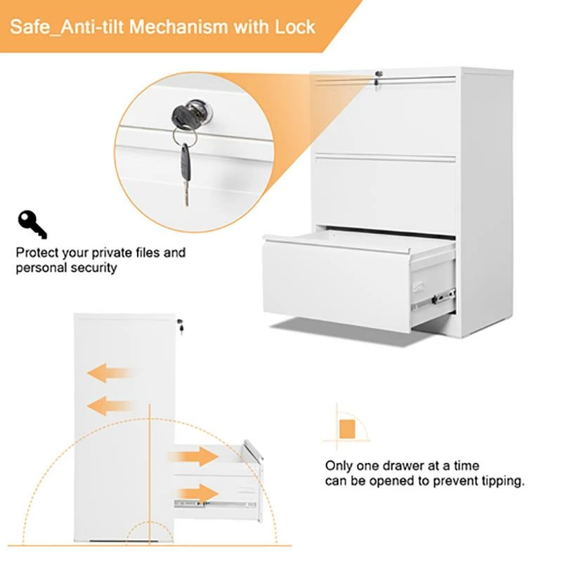High-quality Material and Smooth Surface: 100% steel material is made into solid lateral file cabinets, which is very durable and stable for your daily use at home and office. Besides, the surface of modern fling cabinet with smooth power coating, which will prevent the cabinets from being scratched. Spacious Storage Space: Deep and spacious 3 drawers on full-extension ball-bearing slides with side-to-side hang rails. The hanger rod of this lateral file cabinets can be moved and adjusted, thus this filing cabinet can accommodate Legal size, Letter size, A4 folders flexibly. Anti-tilt Mechanism Design: Designed with full extension and steel ball-bearing suspension, all drawers can be open and close quietly and easily. When one drawer is open, the interlocking drawer system prevents the other drawer from opening, which prevents tipping. Reinvent Your Workspace: This large metal filing cabinet with file drawers and storage cabinet is designed to keep the office machines, paper, files and suppliers organized. Built-in lock with 2 keys. Lock secure all three drawers. Spacious and deep drawers, perfect for organizing paperwork and folders. Steel construction and reinforced structure ensure longevity.