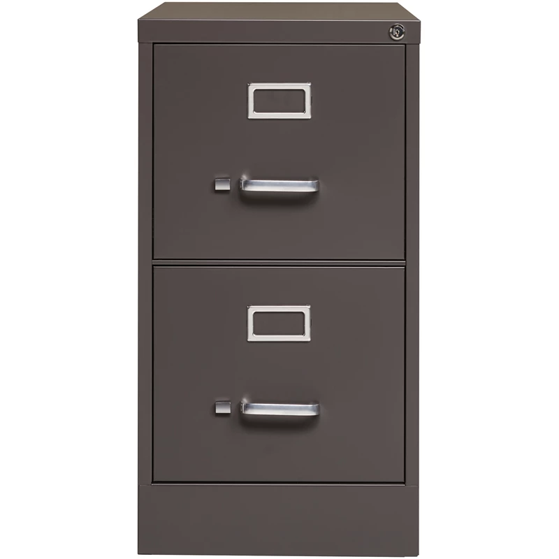 26.5-inch deep metal two-drawer, letter width, commercial grade vertical file cabinets in medium tone/espresso are perfect for business, educational, or personal offices. These cabinets feature a classic design and are constructed with high quality durable materials that are suitable for heavy-duty use. Ships fully assembled and is ready to accept letter width hanging file folders. Non-porous surface is easy to clean and disinfect. Each drawer includes full extension ball-bearing slides for smooth drawer action. Even fully loaded, these drawers open with ease. Adjustable follower wires keep files upright. The aluminum handles and label holder are durable and functional making it easy to access and label drawer contents. The included core-removable lock allows cabinets to be keyed alike. Designed to meet or exceed ANSI/BIFMA industry standards for performance and workmanship. Made with 28% total recycled content. Backed by a Limited Lifetime Warranty. TAA Compliant. Greenguard Gold certified for indoor air quality.