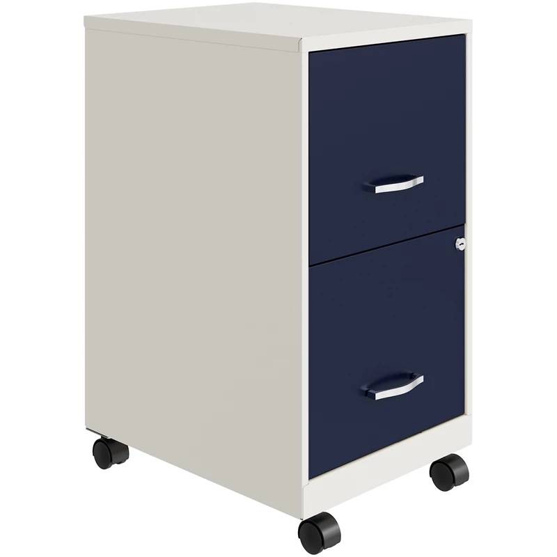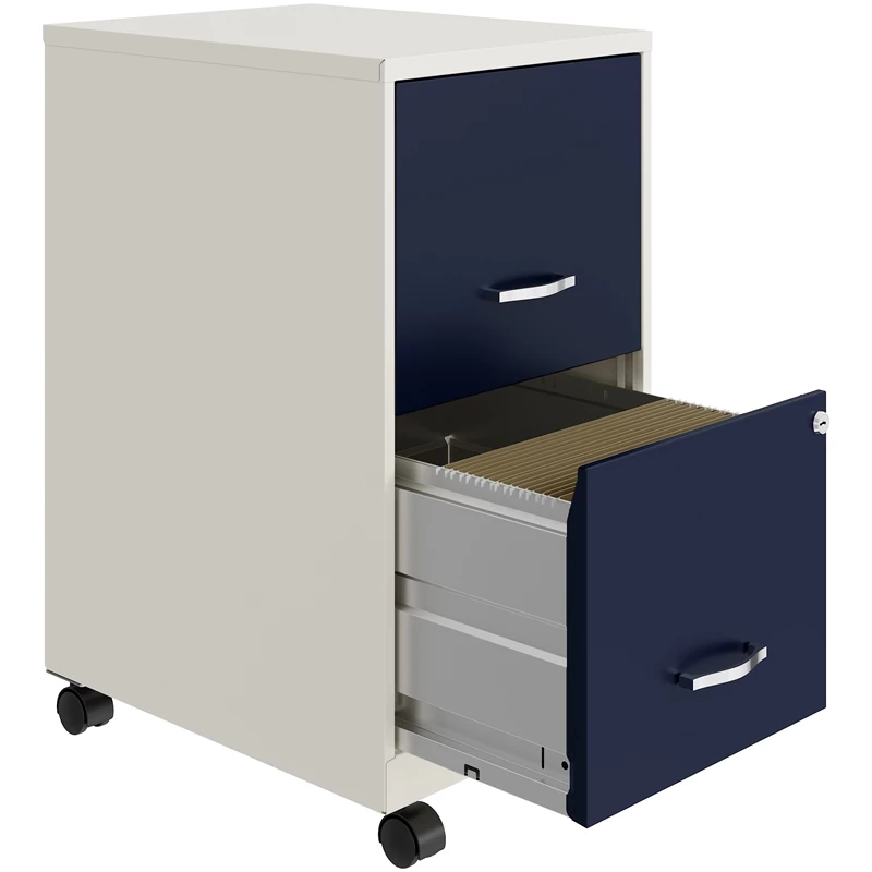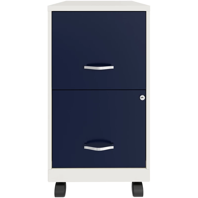 The Mobile 2-Drawer Metal two-tone File Cabinet in white/navy is designed for small office or home office use. The cabinet features a smart, efficient design that works well in small spaces and fits under most work surfaces or desks. Each drawer features high-sides to accommodate letter-sized hanging files. The drawers are also a perfect storage solution for other office essentials. Using a patented glide suspension, the drawers have a smooth open and close slide with a three-quarter drawer extension to prevent tipping. In addition, you can keep your files and possessions secure by using the built-in lock for both drawers. The additional wheels that come with this file cabinet are both stylish and functional which makes it easy to move around your home or office. Painted steel surface is non-porous and easy to clean. Bring organization and function to your home or office with this stylish mobile two-drawer file cabinet. Your supplies and files will always be organized and within reach!