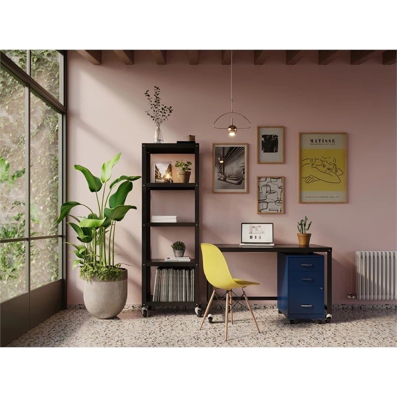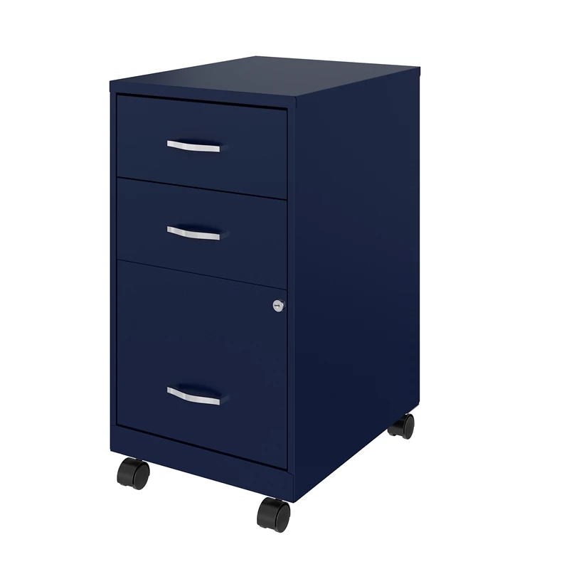The 3-Drawer Organizer Metal File Cabinet in navy is a multi-functional file cabinet perfect for storing files, supplies, and accessories for your small office or home office. Featuring one file drawers and two storage drawers, this file cabinet features a smart, efficient design that works well in small spaces and fits under most work surfaces or desks. Each drawer features high-sides to accommodate letter-sized hanging files. The top two accessory drawers are the perfect storage for office essentials. The additional wheels that come with this file cabinet are both stylish and functional which makes it easy to move around your home or office. Using commercial grade ball bearing slides, the drawers have a smooth open and close slide with a three-quarter drawer extension to prevent tipping. In addition, you can keep your files and possessions secure by using the built-in lock for the bottom two drawers. Painted steel surface is non-porous and easy to clean and disinfect. Bring organization and function to your home or office with this three-drawer file cabinet!