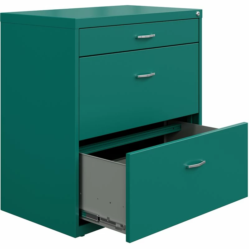 The FFP SOHO metal lateral file in teal/turquoise features a sleek arc pull to add a touch of sophistication to your work area while the cabinet provides storage and flexibility. This lateral is a durable, economical storage solution and is great for home offices. The cabinet has a core-removable lock for security and two adjustable leveling guides for stability. Full high-side file drawers provide versatile storage and the pencil drawer allows space for other office or personal essentials.