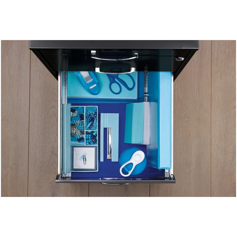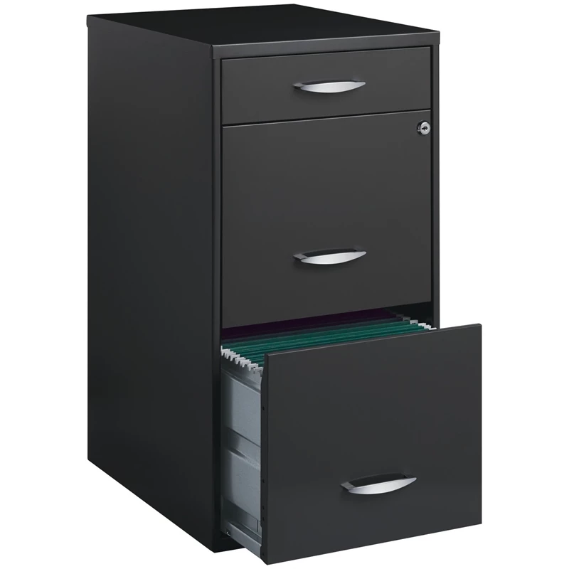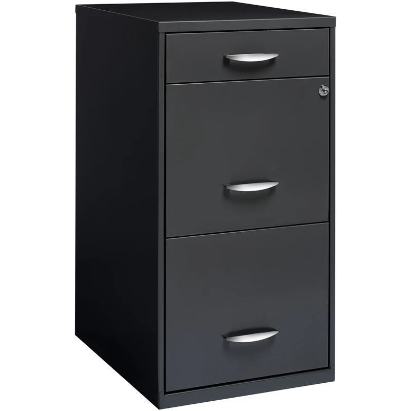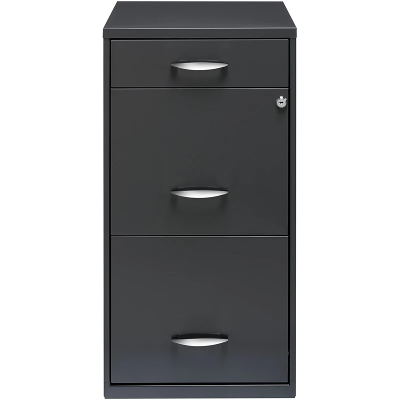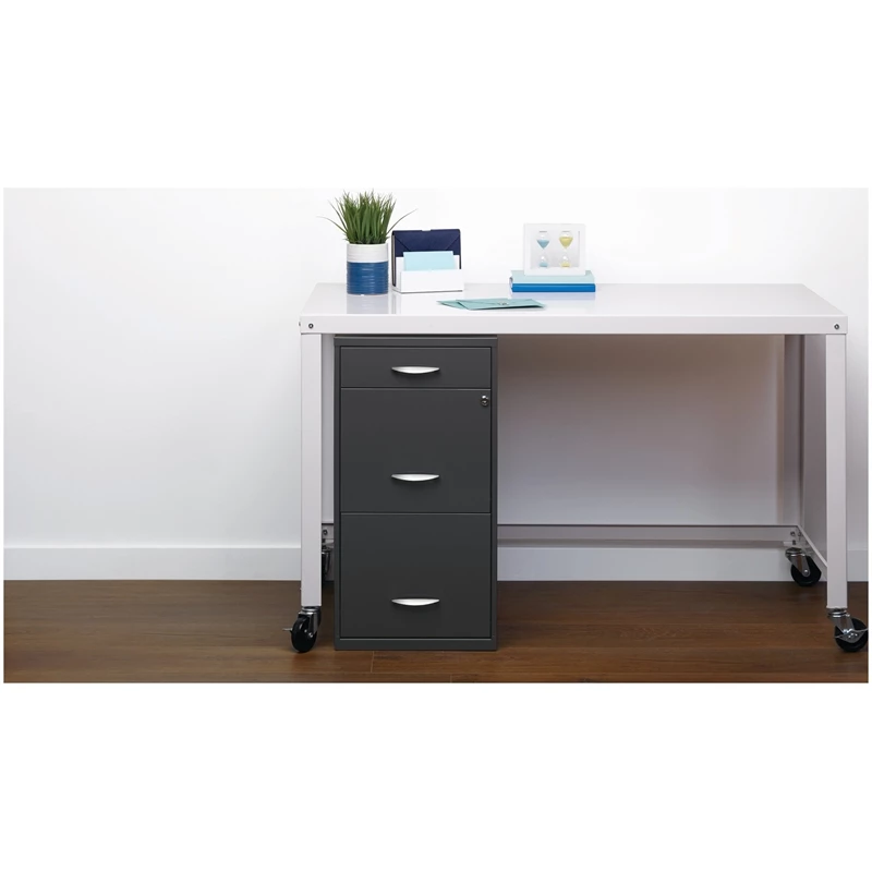 The Three Drawer Metal File Cabinet in charcoal is the ideal storage solution for any small office or home office. Featuring two file drawers and an additional small storage drawer, this file cabinet is the perfect solution for your home office needs. This file cabinet features a smart, efficient design that works well in smaller spaces, and fits under most work surfaces or desks. Each drawer features high-sides to accommodate letter sized hanging files. The top pencil drawer can also be perfect storage for other office essentials. Using a patented glide suspension, the drawers have a smooth open and close slide with a three-quarter drawer extension. In addition, you can keep your files and possessions secure by using the built-in lock for both drawers. Painted steel surface is non-porous and easy to clean. Bring organization and function to your home or office with this three-drawer file cabinet!