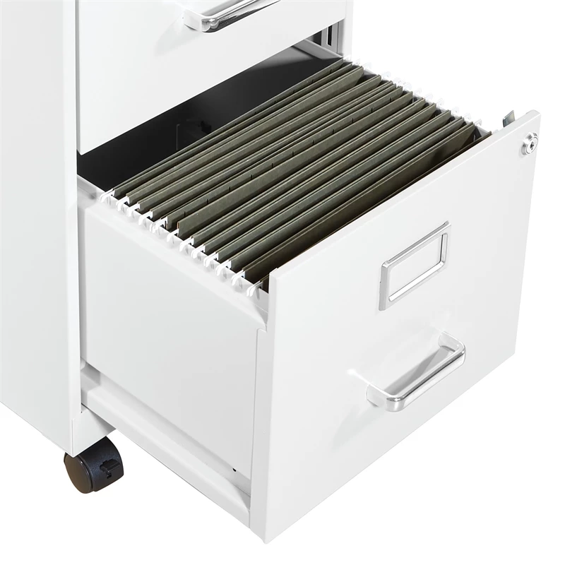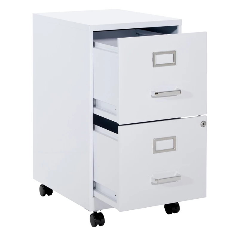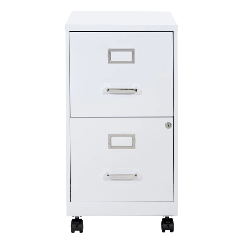 2 Drawer Mobile Locking Metal File Cabinet in White Keep files organized and your office working at peak performance with our locking metal file cabinet with mobile casters. Available in several colors to match any workspace. Deep full sided drawers glide smoothly keeping files at your fingertips and locking lower drawer offers storage for important documents or valuables. Ships fully assembled.