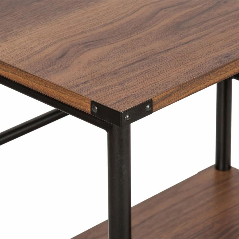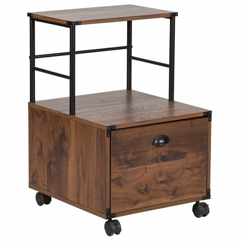 Perfecting an industrial vibe and an industrious design, this small mobile file cabinet and shelf will expand your home office’s organization and look good while doing so. One file drawer and one open shelf provide copious storage for folders and even a printer. The full extension drawer within the cabinet has dimensions compatible with a4 storage, and a maximum weight capacity of 10 lbs., and included file bars also aid in setting up the perfect office. Finished in warm walnut wood, the portable file cabinet has black steel pull handles for added rustic-industrial appeal, and built-in wheels provide instant mobility and ease of use.