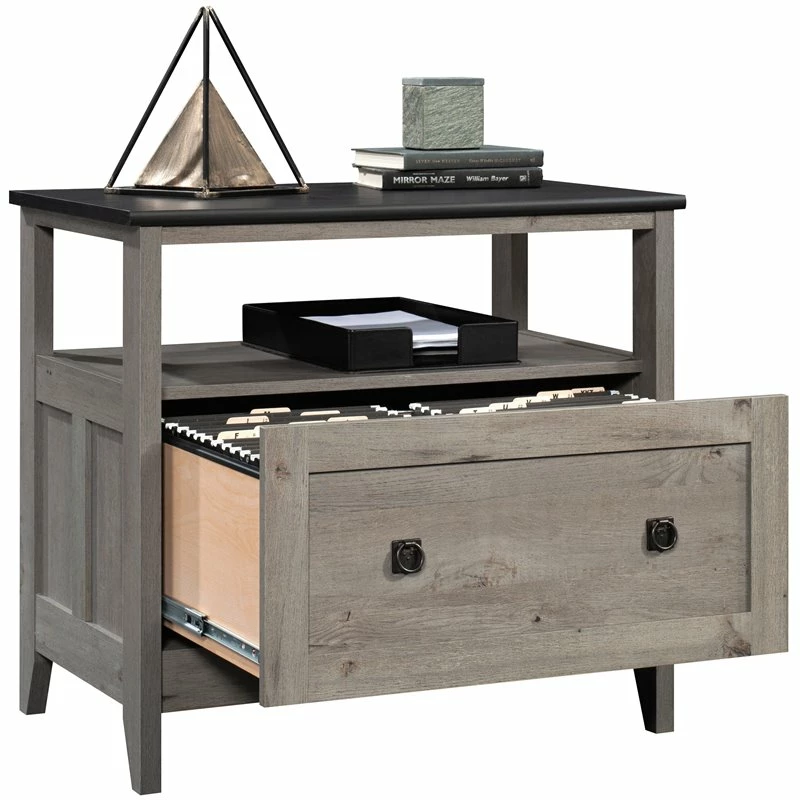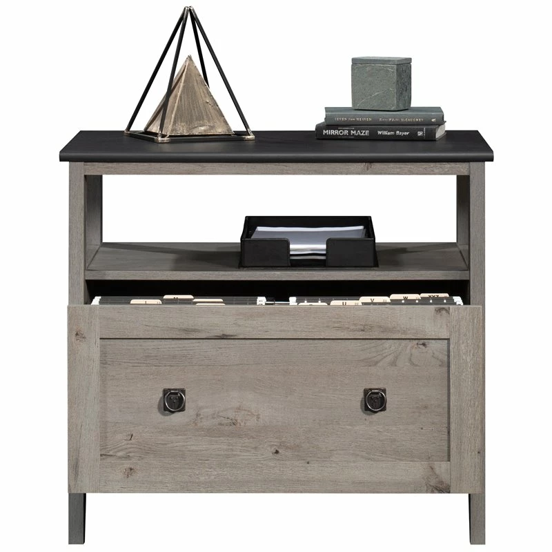 As versatile as it is beautiful, this lateral file cabinet from the August Hill collection is what you need for your home office. This 1-drawer lateral file cabinet features a single drawer with full extension slides that holds letter, legal, or European-size hanging files. Never fear that a file is too big. There is room for all of them! The open shelf of this lateral file cabinet features room for additional storage of books, home décor, and more. The spacious top shelf of this open shelf filing cabinet has enough room for your to-do list, photos of you family, or a lamp. Finished on all sides for versatile placement, this 1-drawer file cabinet will look polished from every angle. The patented T-lock drawer system makes assembly quick and easy, so you can turn your attention to other things more quickly. A Mystic Oak® finish with Raven Oak™ accent adds an elegant touch to this legal-size filing cabinet.