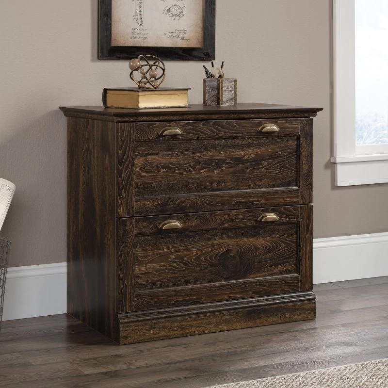For a stately addition to your home office, this lateral file from the Barrister Lane® collection is your top choice. The top surface of this filing cabinet is large enough for home décor, a lamp, your to-do list, and much more. The drawers of this 2-drawer lateral file cabinet use full extension slides for smooth ease of use. Both drawers on this lateral filing cabinet hold letter or legal-size hanging files. An interlocking safety mechanism only allows one drawer to open at a time. This 2-drawer filing cabinet features a quick and easy assembly process with a T-lock drawer system, so you can get to filing as quick as possible. A beautiful Iron Oak finish with a complex woodgrain makes this wood lateral file a stylish statement piece in your home. Whether you need file storage in the home office, spare room, or living room, this legal-size filing cabinet is the ideal choice.