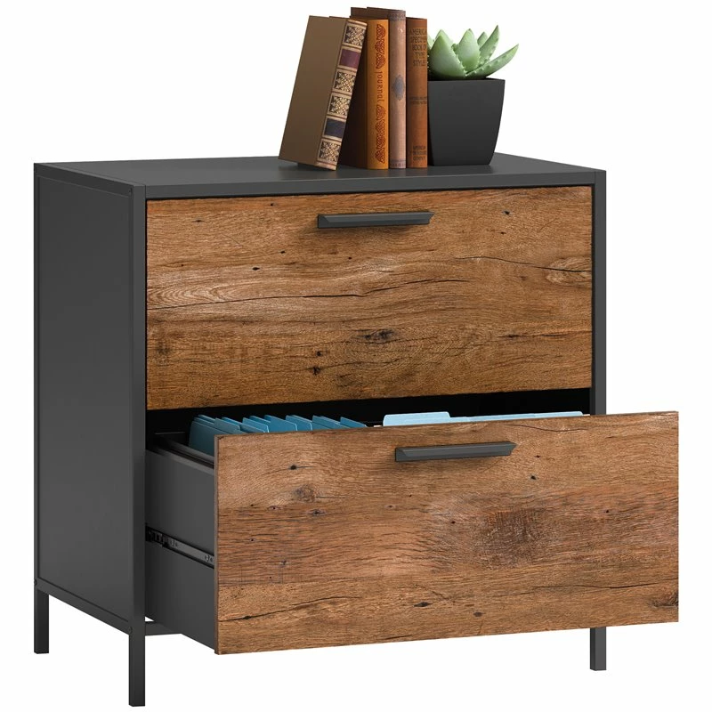 Upgrade your home office, or any room you choose, with the retro-industrial feel of the lateral file from the Boulevard Café collection. This modern file cabinet features a top surface for display of books, photos, or an accent lamp. The top also makes a great spot to place your printer. The unique minimalist design makes this 2 drawer lateral file cabinet sleek and stunning while equipped with drawers with full extension slides that hold letter or legal size hanging files. A durable, powder coated metal frame and a Black finish with Vintage Oak® accents rounds out this modern design. Forget what you know about filing cabinets, including the plain Jane beige metal variety because this wood lateral file cabinet will make you forget you’re supposed to be working. We hope you like what you see. Sauder designers travel the world and bring back the best and latest in style, finish, and color trends. This inspiring world travel is evident in the cutting edge and innovative furniture solutions we offer to you!