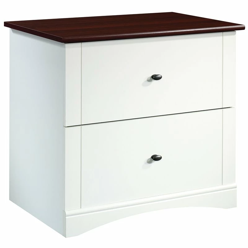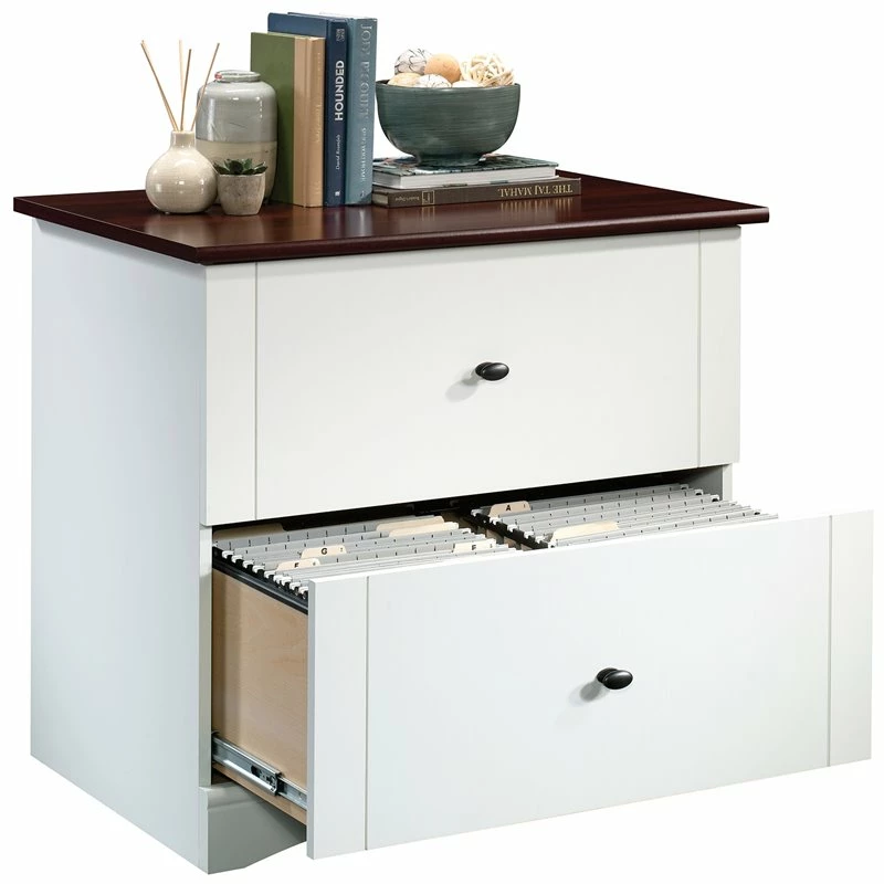 Looking to add convenient storage to your home without having to sacrifice on style? Well, we’ve got just what you’re looking for. Create the storage options you need while adding the style you want with this lateral file from the Sauder Select collection. The spacious top surface of this white file cabinet makes a great place to store and display a variety of different items like an accent lamp, your printer, decorative plants and photos of your family and friends. This wood lateral file cabinet features two large storage drawers with full extension slides that can hold letter or legal-size hanging files so you can keep all your important documents organized. This 2-drawer lateral file cabinet is designed with a patented, interlocking safety mechanism that allows only one drawer to open at a time for added safety. Quick and easy assembly with a patented T-slot drawer system means that your new filing cabinet will be put together in no time. Finished in Soft White® with Select Cherry accents, this beautiful wood file cabinet will have you feeling organized in a flash.