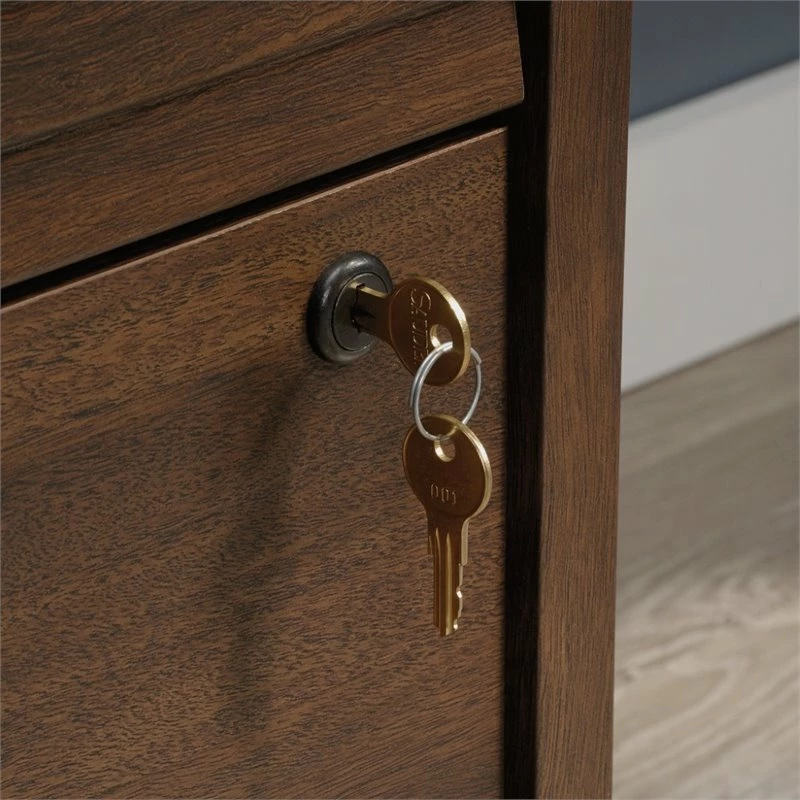 Looking for a solution for your unorganized mess of papers? Look no further! Create the additional storage space your home office needs while adding the style that you love with this lateral file from the Englewood™ collection. This office storage features two large drawers with full extension slides that can hold letter or legal size hanging files so you can have a place for all your important documents. The patented, interlocking safety mechanism only allows one drawer to open at a time for extra safety precautions. The drawers also lock for secure storage options. The upper drawer features a louver detailed front for an extra touch of style that is sure to stand out. The top features a strong and lightweight 1” panel construction and offers a spacious surface to store and display different things like decorative plants, a wireless printer, work binders, and framed photos of your family. Finished in spiced mahogany™, this good-looking lateral file will have you feeling organized in no time!
