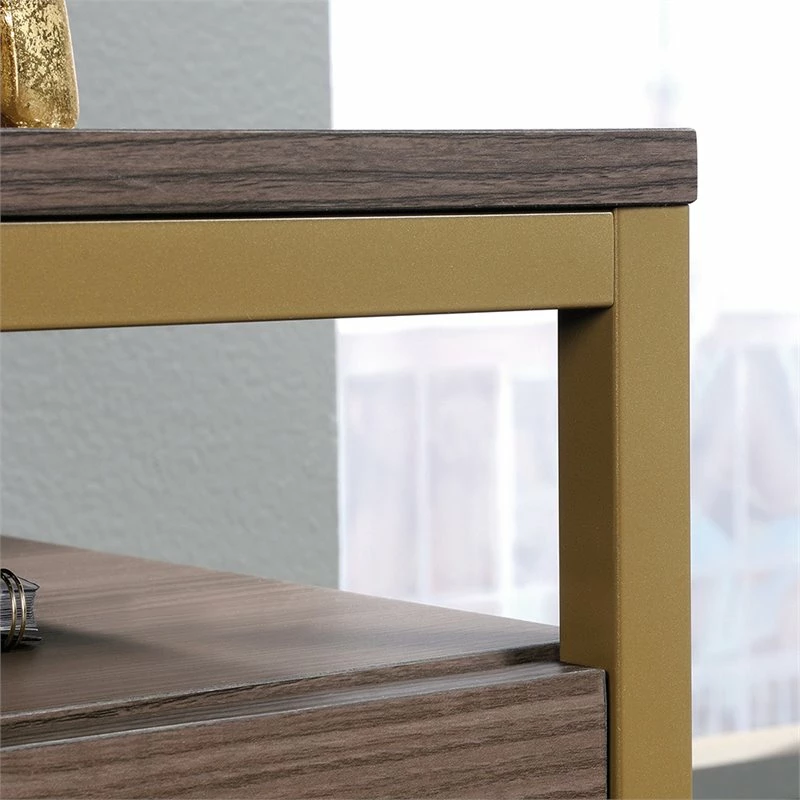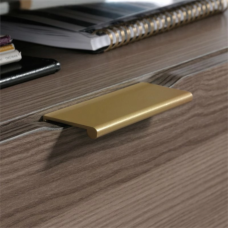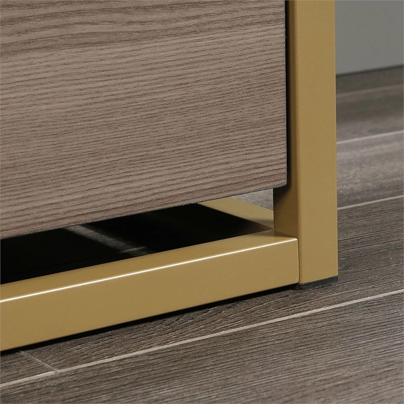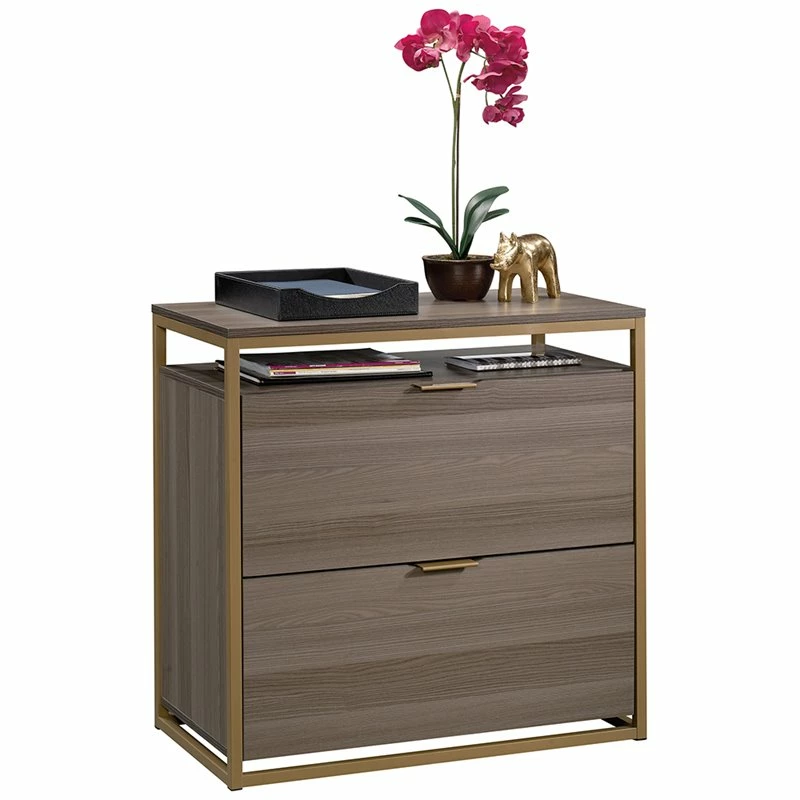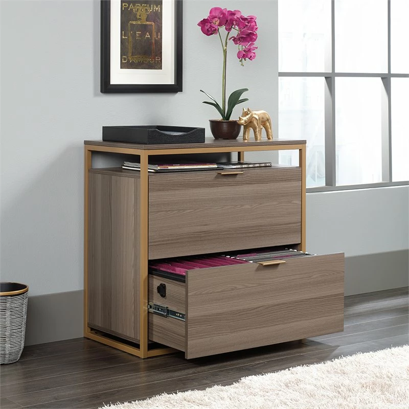 File in style. Create versatile storage options in your home without having to sacrifice the beautiful style you love with this lateral file from the International Lux collection. It features two large drawers with full extension slides that accommodate letter-size hanging files so you can keep all your important documents organized. Its interlocking safety mechanism allows only one drawer to open at a time for added safety. It also features an open storage shelf above the top drawer for easy access storage of items like folders and books. Its spacious top surface makes a great place for additional storage and display of items like an accent lamp, your printer, knick-knacks and photos of your family. It’s finished on all sides for versatile placement throughout your home. Finished in diamond ash and detailed with a gold, powder coated metal frame and stylish hardware, this beautiful file cabinet will have you feeling organized in no time.