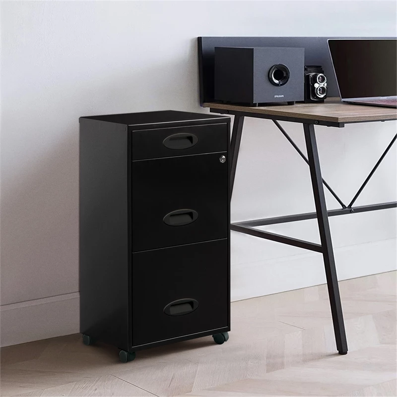 The 3-Drawer Metal File Cabinet is a multifunctional file cabinet perfect for storing files, supplies, and accessories for your small office or home office. Featuring two file drawers and an additional small storage drawer, this file cabinet features a smart, efficient design that works well in small spaces and fits under most work surfaces or desks. Each drawer features high-sides to accommodate letter-sized hanging files. The top pencil drawer is the perfect storage for other office essentials. The additional wheels that come with this file cabinet are both stylish and functional which makes it easy to move around your home or office. Using a patented glide suspension, the drawers have a smooth open and close slide with a three-quarter drawer extension to prevent tipping. In addition, you can keep your files and possessions secure by using the built-in lock for the top two drawers. Painted steel surface is non-porous and easy to clean. Bring organization and function to your home or office with this three-drawer file cabinet!
