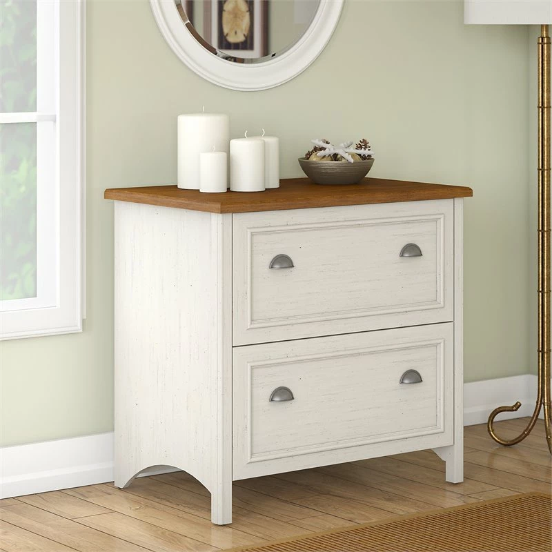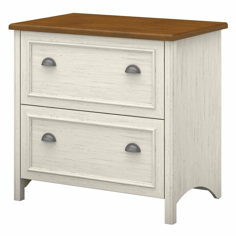 Blend style and functionality in your home office with the Scranton & Co Furniture Fairview 2 Drawer Lateral File Cabinet in Antique White. The charming Tea Maple top surface and beautiful Antique Pewter hardware accents blend perfectly with existing decor. Height matches the Fairview Computer Desk (sold separately) for an extended work surface when positioned side-by-side. Full-extension file drawers glide on smooth ball bearing slides for easy access to letter, legal or A4-size files. An interlocking drawer mechanism prevents tipping for added safety. Fairview meets ANSI/SOHO quality test standards for performance and safety and comes with 1 Year Manufacturer’s Warranty. With casual styling and traditional detail, Fairview offers an alluring appearance without sacrificing functionality. See the full collection for coordinating home and office items available.