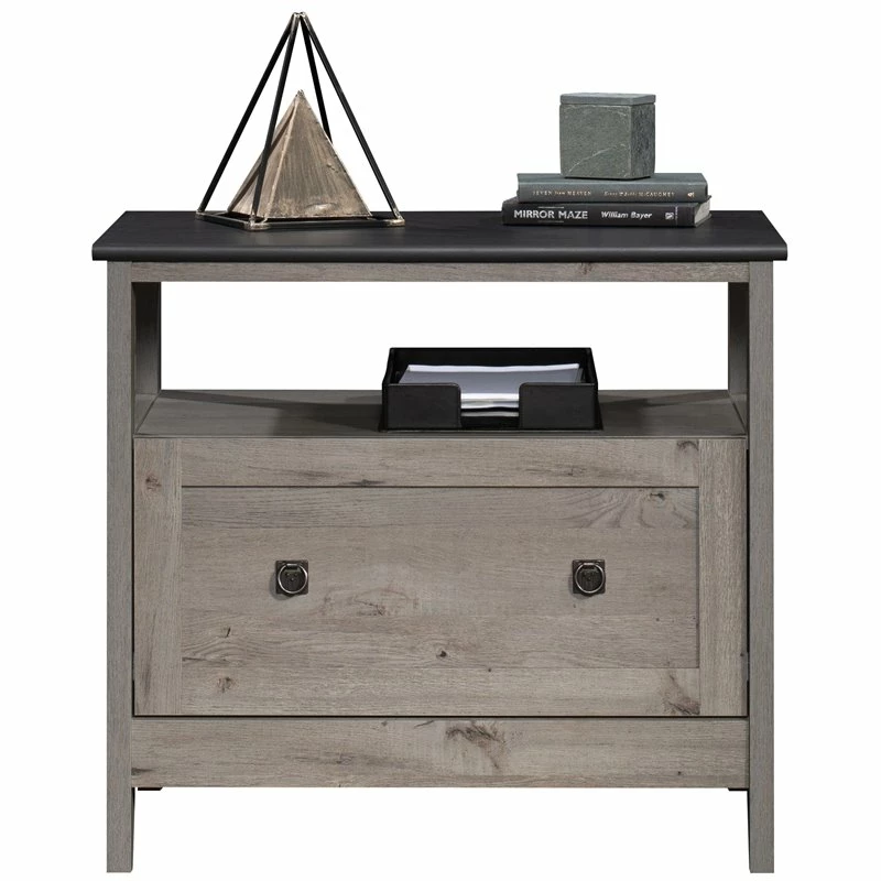 As versatile as it is beautiful, this lateral file cabinet from the UrbanPro collection is what you need for your home office. This 1-drawer lateral file cabinet features a single drawer with full extension slides that holds letter, legal, or European-size hanging files. Never fear that a file is too big. There is room for all of them! The open shelf of this lateral file cabinet features room for additional storage of books, home décor, and more. The spacious top shelf of this open shelf filing cabinet has enough room for your to-do list, photos of you family, or a lamp. Finished on all sides for versatile placement, this 1-drawer file cabinet will look polished from every angle. The patented T-lock drawer system makes assembly quick and easy, so you can turn your attention to other things more quickly. A Mystic Oak finish with Raven Oak accent adds an elegant touch to this legal-size filing cabinet.