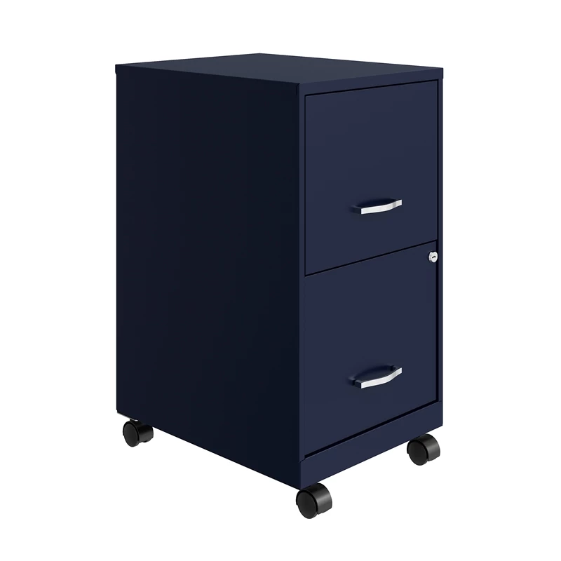 The Mobile 2-Drawer Metal File Cabinet in Navy is designed for small office or home office use. The cabinet features a smart, efficient design that works well in small spaces and fits under most work surfaces or desks. Each drawer features high-sides to accommodate letter-sized hanging files. The drawers are also a perfect storage solution for other office essentials. Using a patented glide suspension, the drawers have a smooth open and close slide with a three-quarter drawer extension to prevent tipping. In addition, you can keep your files and possessions secure by using the built-in lock for both drawers. The additional wheels that come with this file cabinet are both stylish and functional which makes it easy to move around your home or office. Painted steel surface is non-porous and easy to clean and disinfect. Bring organization and function to your home or office with this stylish mobile two-drawer file cabinet. Your supplies and files will always be organized and within reach!