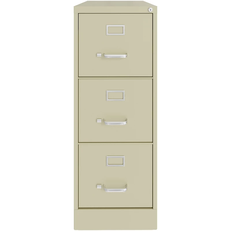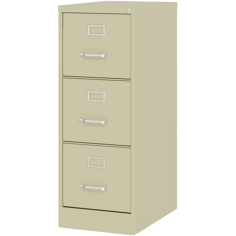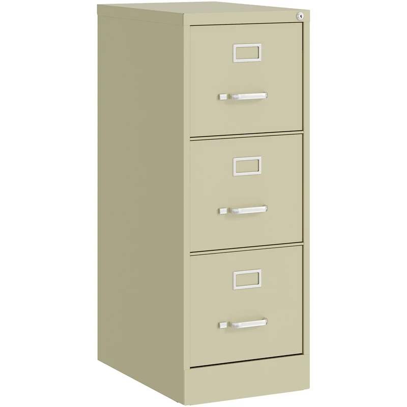 22-inch deep three-drawer, letter width, commercial grade in Putty/beige vertical metal file cabinets are perfect for business, educational, or personal offices. These cabinets feature a classic design and are constructed with high quality durable materials that are suitable for heavy-duty use. Ships fully assembled and is ready to accept letter width hanging file folders. Non-porous surface is easy to clean and disinfect. Each drawer includes 80% extension ball-bearing slides for smooth drawer action. Even fully loaded, these drawers open with ease. Adjustable follower wires keep files upright. The aluminum handles and label holder are durable and functional making it easy to access and label drawer contents. The included core-removable lock allows cabinets to be keyed alike. Designed to meet or exceed ANSI-BIFMA industry standards for performance and workmanship. Made with 28% total recycled content. Backed by a . TAA Compliant. Greenguard Gold certified for indoor air quality.