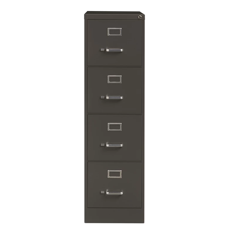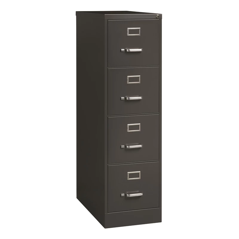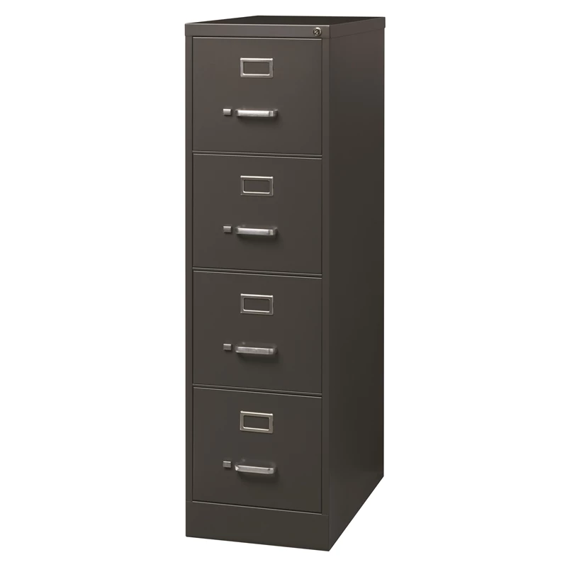 26.5-inch deep metal four-drawer, letter width, commercial grade vertical file cabinets in Charcoal are perfect for business, educational, or personal offices. These cabinets feature a classic design and are constructed with high quality durable materials that are suitable for heavy-duty use. Ships fully assembled and is ready to accept letter width hanging file folders. Non-porous surface is easy to clean. Each drawer includes full extension ball-bearing slides for smooth drawer action. Even fully loaded, these drawers open with ease. Adjustable follower wires keep files upright. The aluminum handles and label holder are durable and functional making it easy to access and label drawer contents. The included core-removable lock allows cabinets to be keyed alike. Designed to meet or exceed ANSI/BIFMA industry standards for performance and workmanship. Made with 28% total recycled content. Backed by a . TAA Compliant. Greenguard Gold certified for indoor air quality.