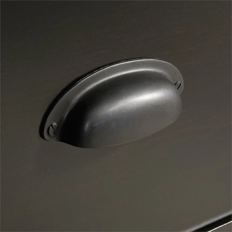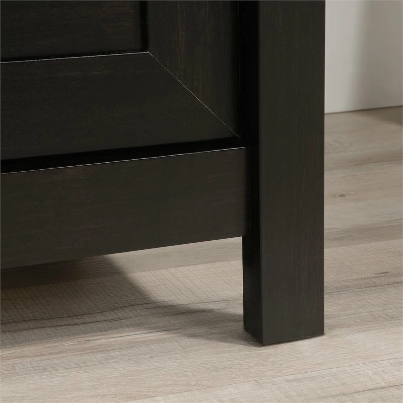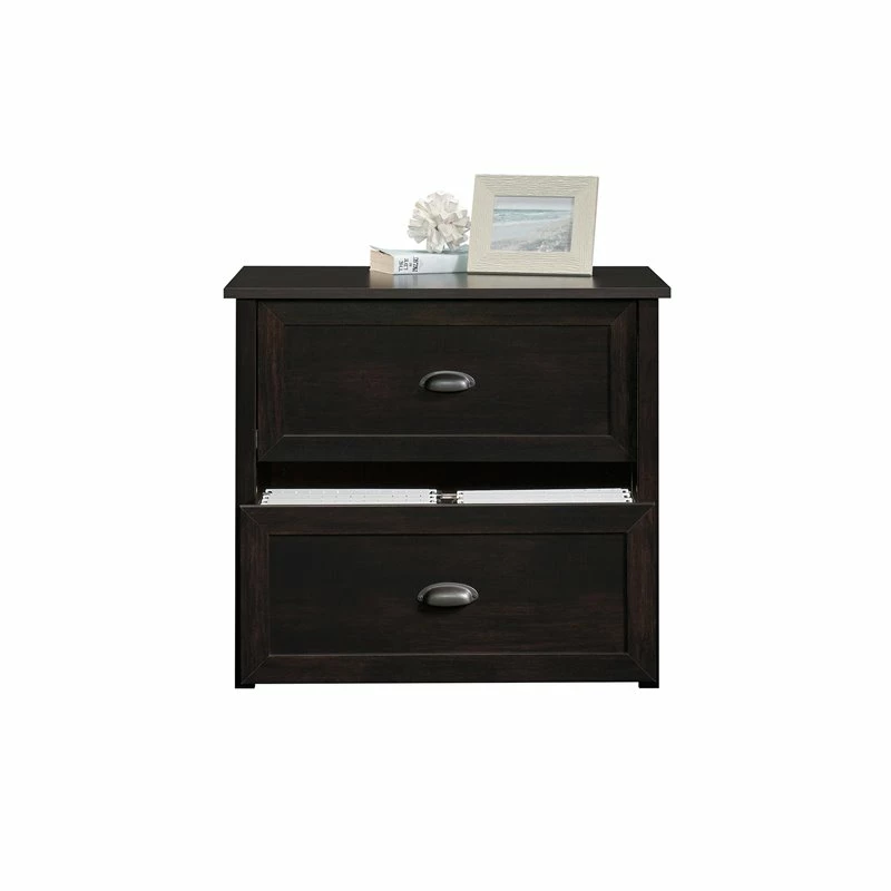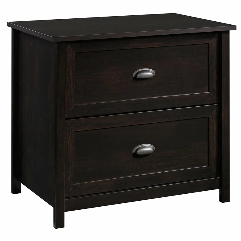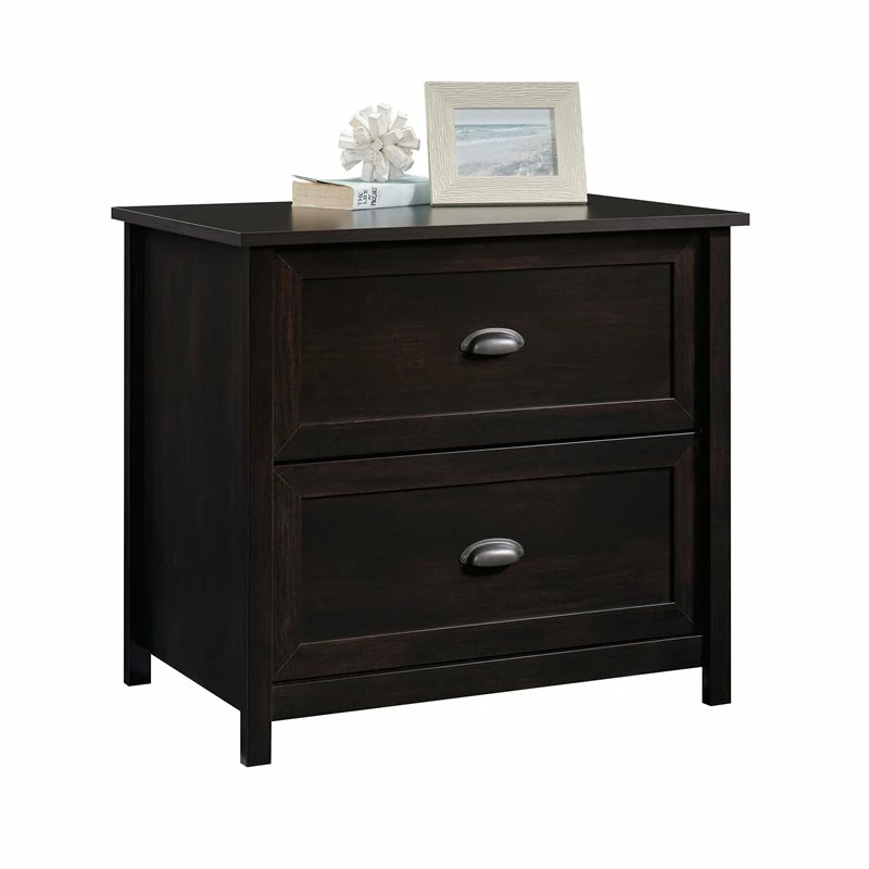 When you’re looking for a lateral file cabinet that is sleek and functional, look no further than the UrbanPro lateral file. This black decorative file cabinet features drawers with full extension slides that hold letter or legal-size hanging files. Finished on all sides for versatile placement in any room of your home, this 2 drawer file cabinet will look great no matter how you arrange—or rearrange—your home. Quick and easy assembly with a patented T-slot drawer system and patented slide-on molding means that your new filing cabinet will be put together in no time. The spacious top surface of this 2 drawer lateral file cabinet has enough room for your lamp, photos, or organizers. Or you can use the top surface to hold your home office printer. With beautiful hardware and a stylish framed panel front, this lateral file could be mistaken for a mini dresser! Finished in Estate Black, this legal-size file cabinet adds trendy, and much needed, file storage to your home.