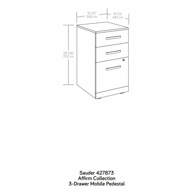 Office storage space can look good too! Style your office area with this pedestal file cabinet from UrbanPro. This 3-drawer pedestal file cabinet features two small drawers with metal runners and safety stops that are ideal for storing office essentials like pens, extra paper, sticky notes, and your planner. The locking, lower drawer of this file cabinet has full extension slides and holds letter or European size hanging files, keeping your most important documents organized and secure. This commercial filing cabinet includes an interlocking safety mechanism that prevents all drawers opening at the same time. For use as a mobile file cabinet, it includes hidden casters for easy movement around the office, so you can rearrange and reorganize easily. This file pedestal is finished on all sides for versatile placement at the office—it will look polished from every angle, showing off its distinct Elm finish. Integrated commercial filing cabinets, like this one, completes your office space with a stylish touch.