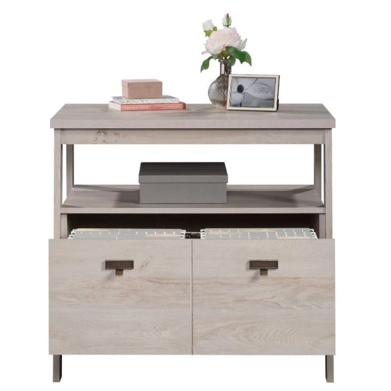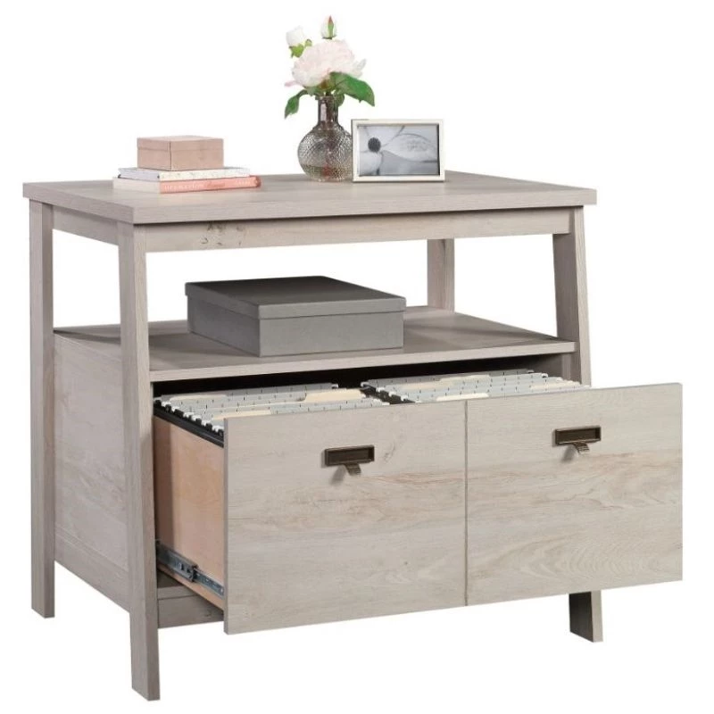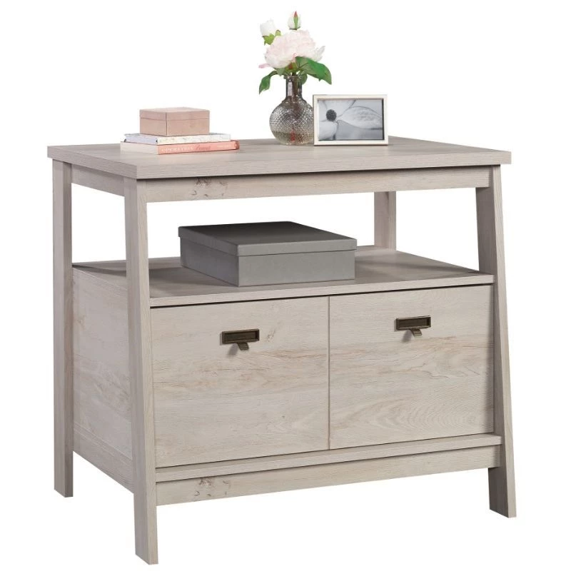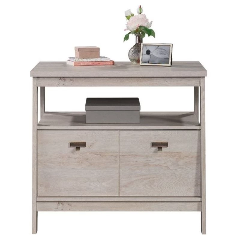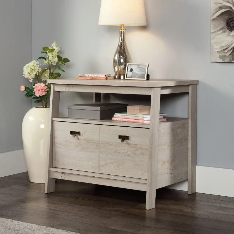 For a stylish 1 drawer lateral file that complements the furniture you already own, look no further than this file cabinet from the UrbanPro collection. This lateral filing cabinet features a drawer with full extension slides that holds letter or legal-size hanging files. An open shelf is a convenient feature of this 1 drawer file cabinet, as it allows additional space for your planner, books, organizing bin, and décor. The top surface is spacious enough for a lamp, your pile of mail, photos of your family, and more. Finished on all sides for versatile placement, this open shelf filing cabinet will look polished from all angles. With a T-lock drawer system, assembly is quick and easy—allowing you to store in style quicker than ever. Finished in a light Chalked Chestnut, add storage where you need it and style as a bonus with this wood lateral file cabinet.