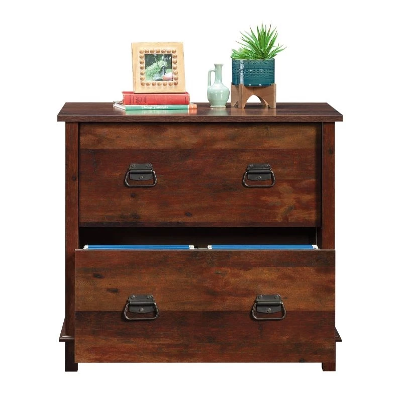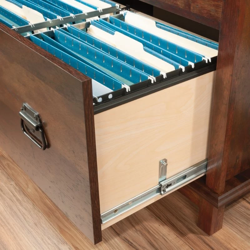 If you’re looking to add hanging file storage to your home office, look no further. This 2-drawer lateral file from the UrbanPro collection is here to fix your storage woes. This lateral filing cabinet features two drawers with full extension slides that hold your most important letter or legal-size hanging files. An interlocking safety mechanism on this 2-drawer filing cabinet ensures that only one drawer can open at a time, preventing tip over accidents. Use the spacious top surface to display framed photos, home décor items, or hold a printer. This wood lateral filing file cabinet is finished on all sides for versatile placement in any room of your home. It will look polished from every angle. Quick and easy assembly with a T-lock drawer system ensures you will be filing as fast as possible. Finished in Curado Cherry, this legal size filing cabinet is the ideal addition to your home office, living room, or anywhere you need file storage.