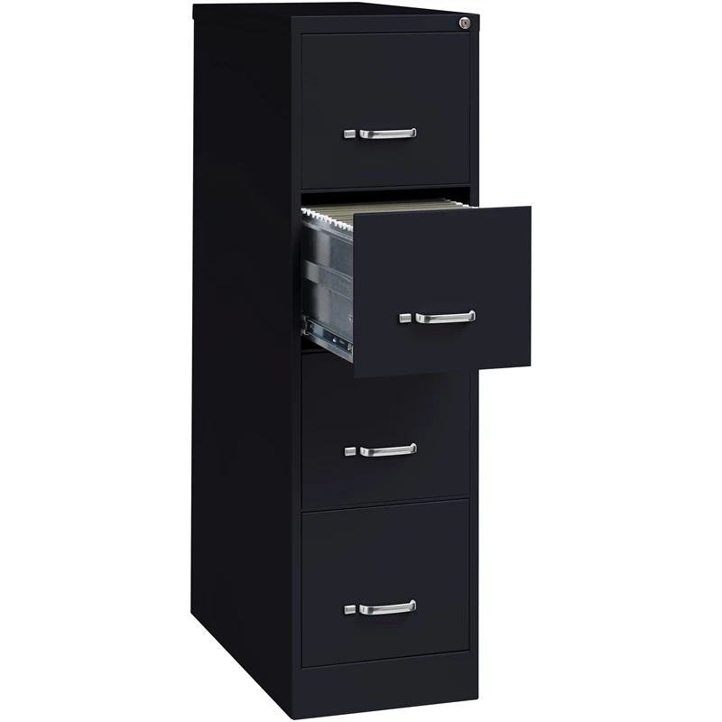 UrbanPro 26.5-inch deep black metal four-drawer, letter width, commercial grade vertical file cabinets are perfect for business, educational, or personal offices. These cabinets feature a classic design and are constructed with high quality durable materials that are suitable for heavy-duty use. Ships fully assembled and is ready to accept letter width hanging file folders. Non-porous surface is easy to clean and disinfect. Each drawer includes full extension ball-bearing slides for smooth drawer action. Even fully loaded, these drawers open with ease. Adjustable follower blocks keep files upright. The aluminum handles and thumb latch are durable and functional making it easy to access drawer contents. The included core-removable lock allows cabinets to be keyed alike. Designed to meet or exceed ANSI-BIFMA industry standards for performance and workmanship. Made with 28% total recycled content. Backed by a Limited Lifetime Warranty. TAA Compliant. Greenguard Gold certified for indoor air quality.
